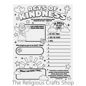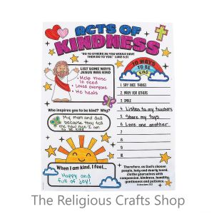Pack of 10 Acts of Kindness Posters. These posters are perfect for groups of children in school or Sunday School. They can follow up from group discussions on how we can be kind to others. Children can then interact in small groups to work on writing a list of acts of kindness and then colour in together. This also then encourages children to feed back their ideas to the larger group. When they are finished, they can be stuck on the wall and remind children of the symbolism of Holy Week and Easter. Posters measure 56cm by 43cm.